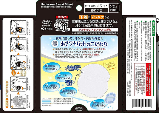 남성용 Riff 땀 겨드랑이 패드 – 땀 얼룩 방지・방취 시트 (화이트, 데오도란트 시트러스 향) 20매(10쌍) × 4개