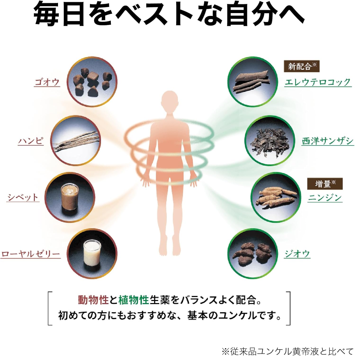 윤케르는 식사만으로는 부족하기 쉬운 비타민과 피로한 몸에 작용하는 생약을 배합.